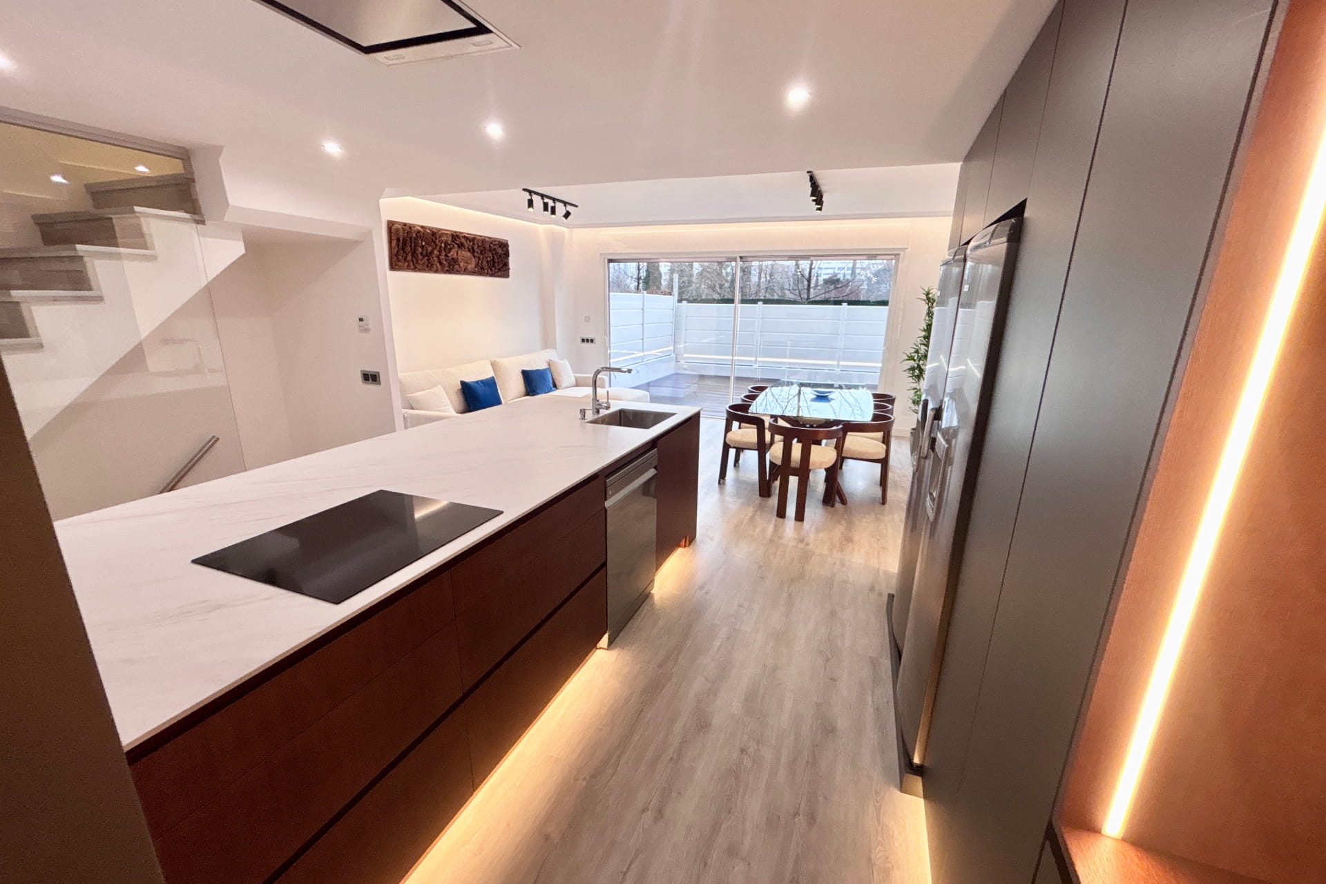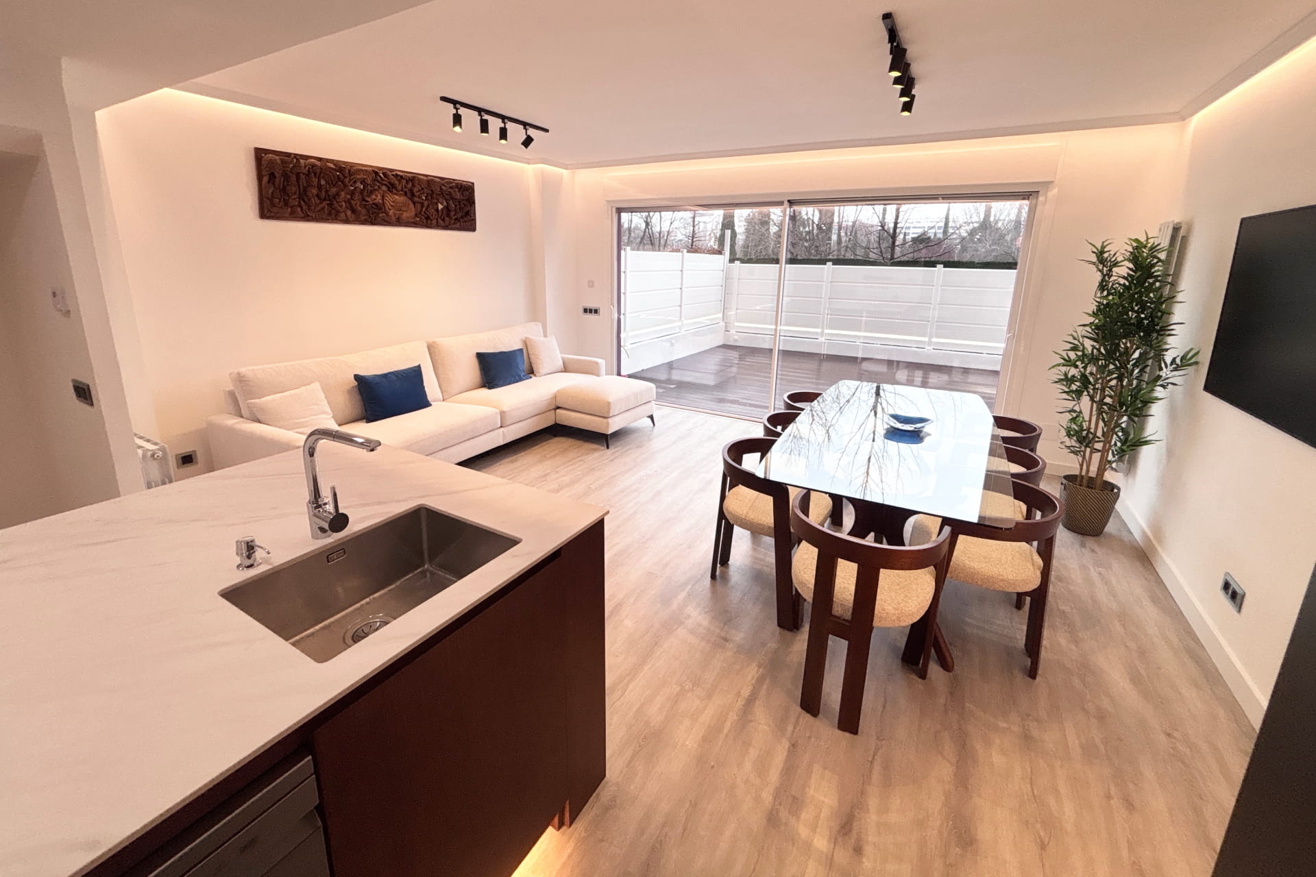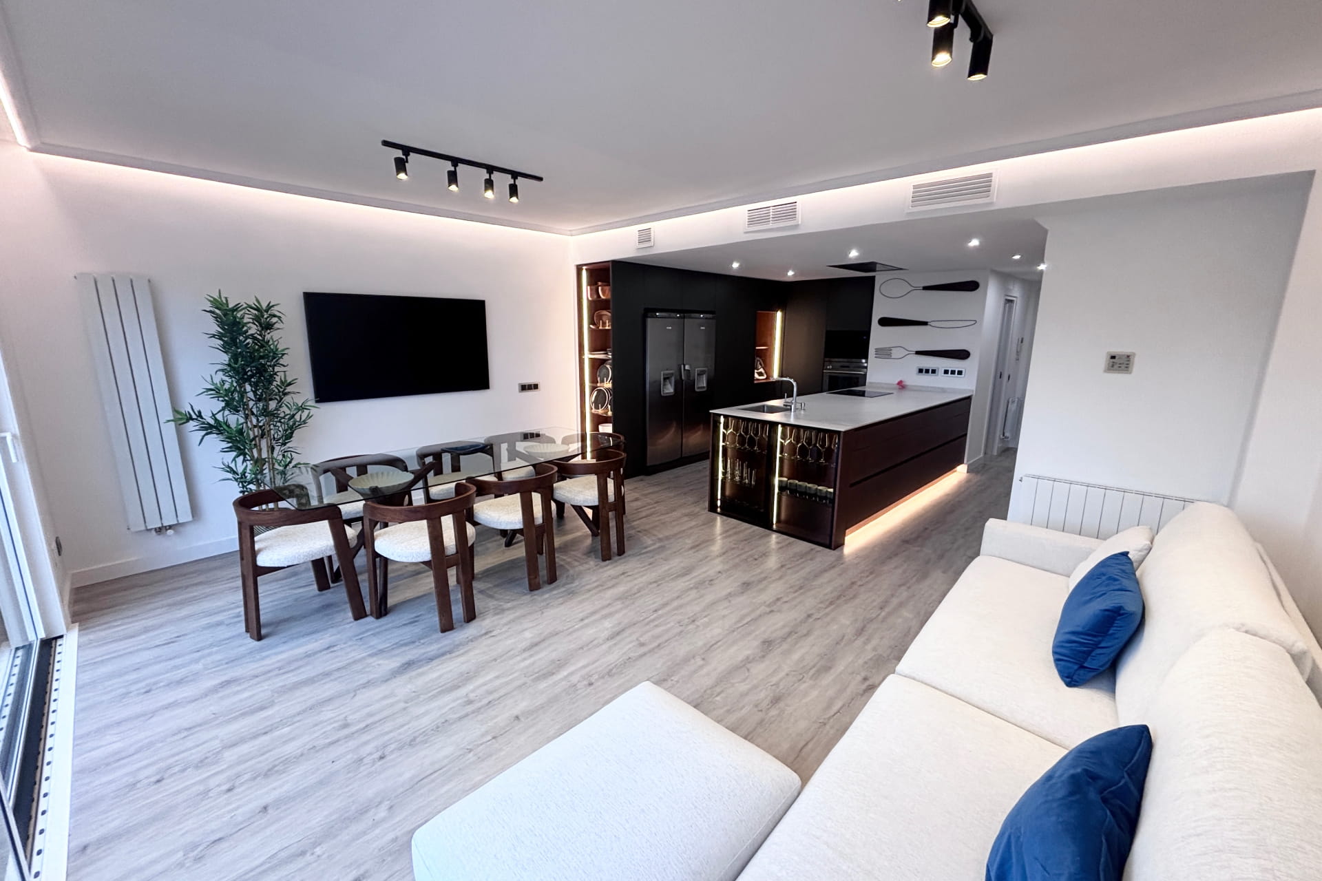 Reforma integral para particular llevada a cabo en el norte de Madrid. Cambio al completo de toda la instalación de fontanería, climatización y electricidad. Eliminación del gotelé de toda la vivienda, cambio de distribución y carpintería. Montaje de mobiliario, baños, sanitarios y decoración exterior entre otros.